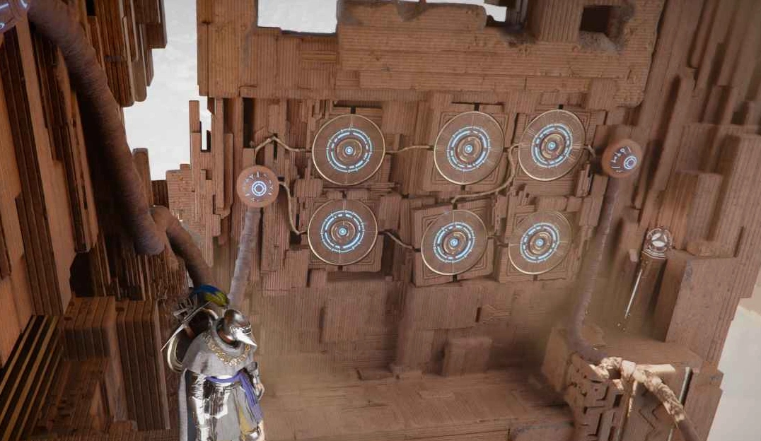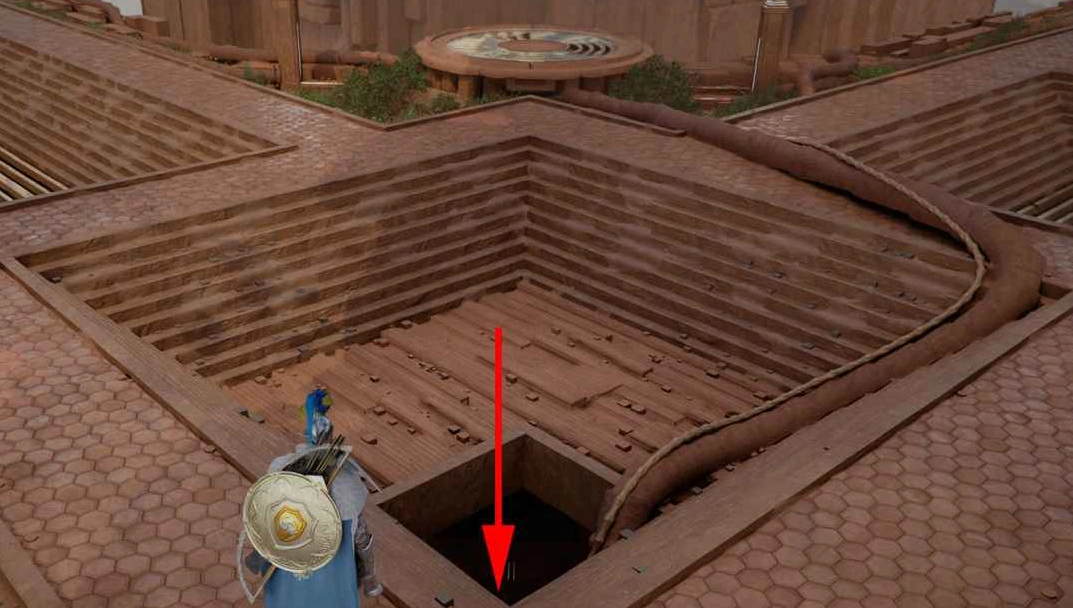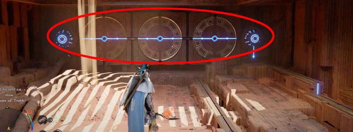 Теперь к самому "Престолу истины". После активации "Гнезда доблести" и прохода по Небесному мосту, вы увидите перед собой двое движущихся врат в небе. Ваша задача — попасть на одни из них, чтобы перенестись на другую сторону. Затем спуститесь вниз через отверстие в земле.