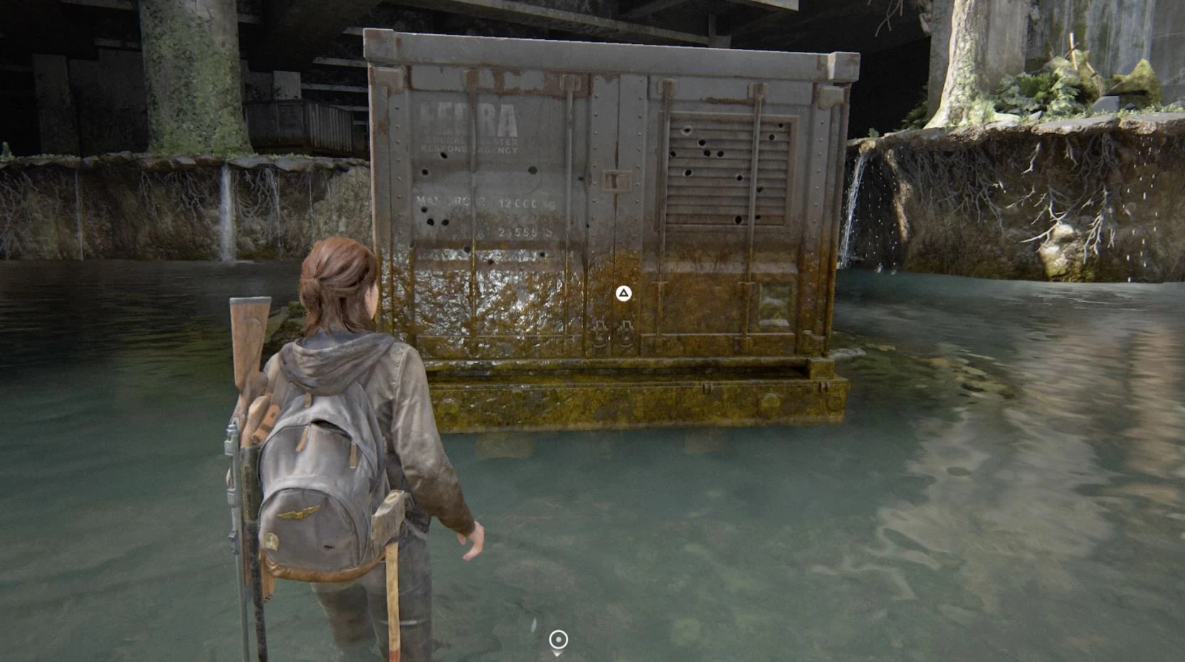 Находится примерно на одном уровне со зданием суда, зайдите в реку и осмотрите заднюю часть затопленного военного транспорта. Здесь есть припасы.