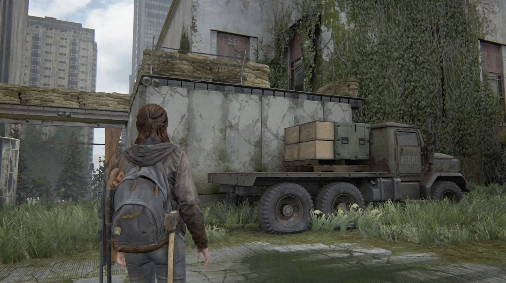 Продолжая идти по улице, вы увидите, что пожарная машина застряла на разрушенном мосту. Взберитесь на капот грузовика и перепрыгните через разлом, чтобы попасть на мост. Здесь можно найти пожарный топор.