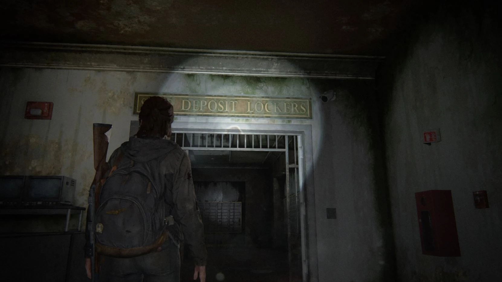 Спускаемся с лошади и заходим через затопленный вход. В фойе банка есть несколько инфицированных, с которыми можно справиться тихо или громко. Очень просто будет проскользнуть за кассы, чтобы незаметно зачистить комнату.
