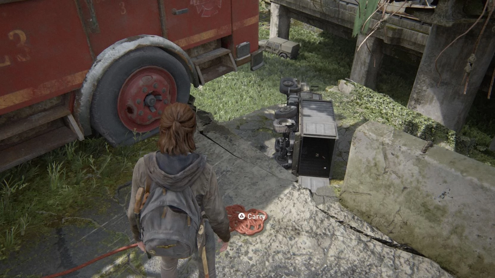 Рядом с пожарной машиной находится трос. Бросьте его через обрушившийся мост и спуститесь вниз. Это приведет вас к поднятой платформе с опрокинутым грузовиком внизу.