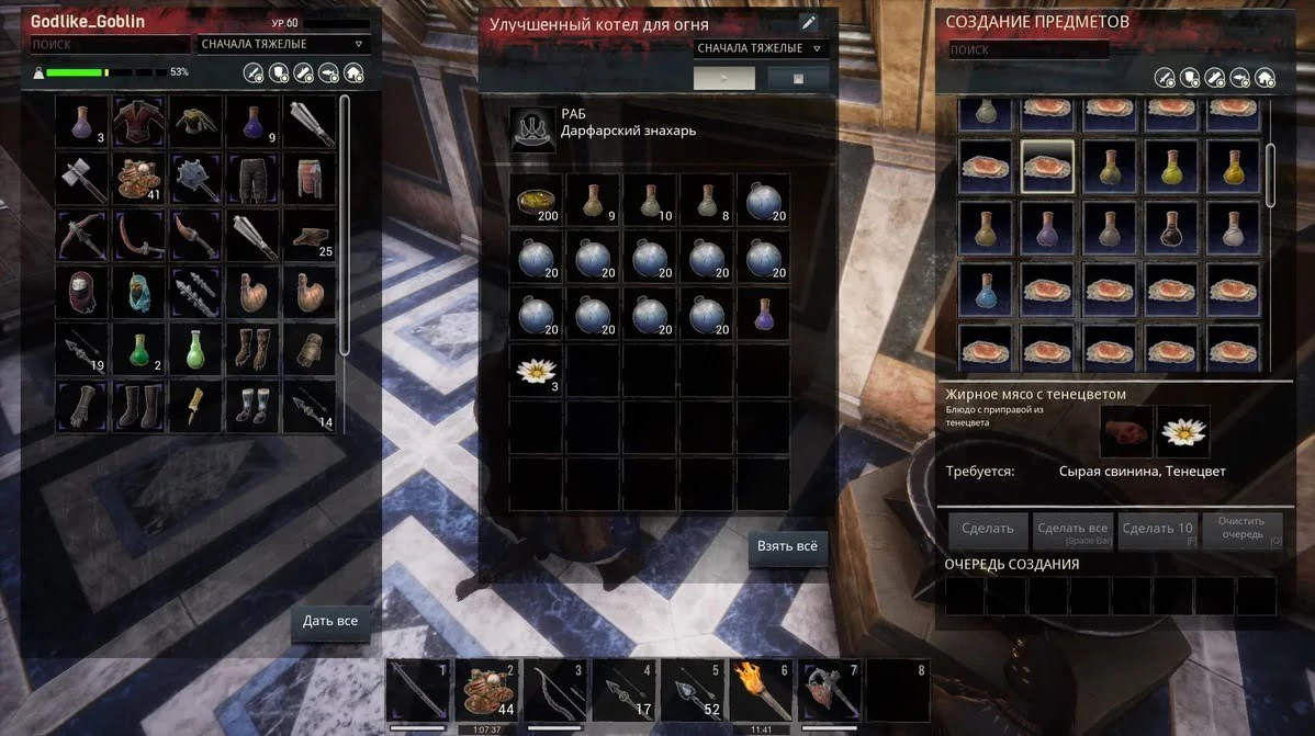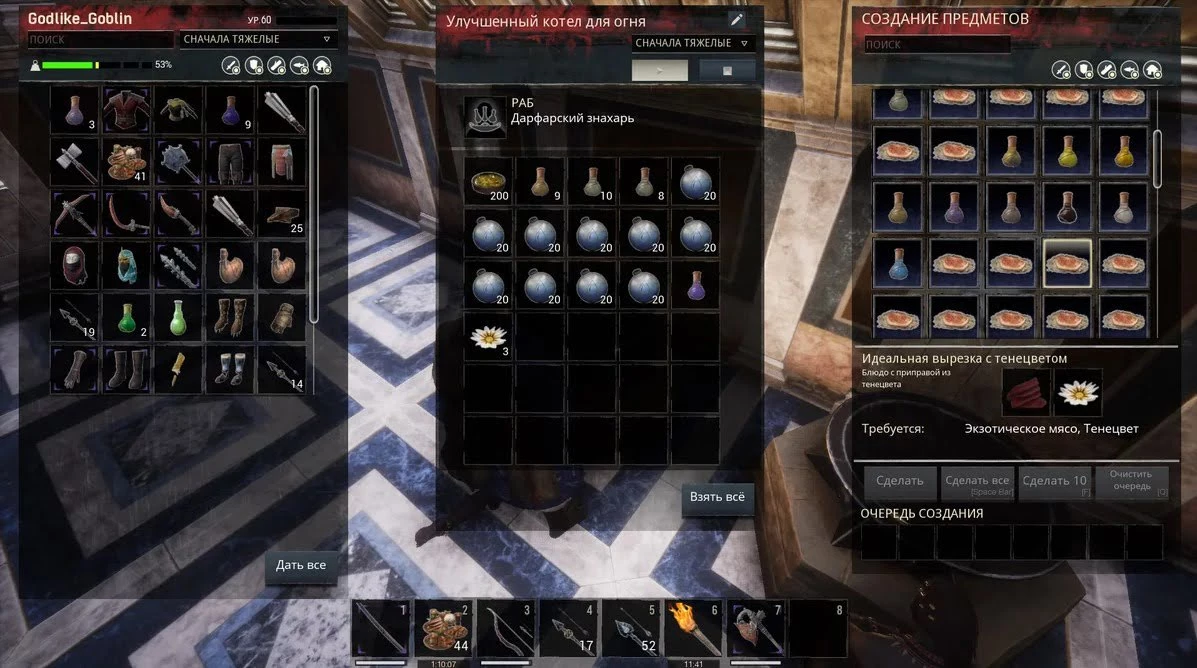 Корм с Тенецветом, как вы наверное помните, можно сделать в Котле для Огня. Для этого понадобятся нужный вид мяса и, собственно, Тенецвет. Запасы которого можно хорошо пополнить во время прохождения подземелья Полуночная Роща.