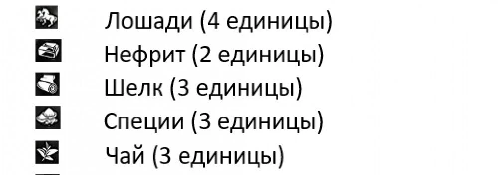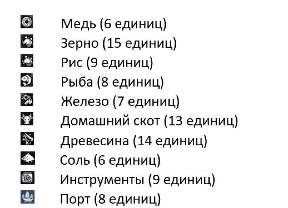 В каждом небольшом поселении можно найти свой ресурс, некоторые из них являются обычными, другие уникальными или редкими. Все ресурсы можно разделить на четыре типа: общие, редкие, городские и уникальные.