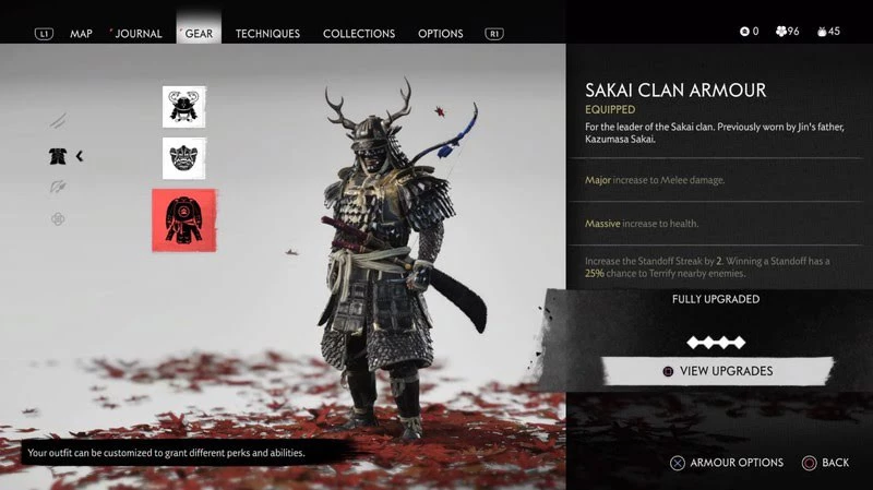В начале игры у Дзина будут прочные доспехи, но после событий пролога они будут разрушены. Эта броня не дает никаких перков, не защищает, не может быть отремонтирована или улучшена. Как итог — поскорее замените ее на любое другое снаряжение.