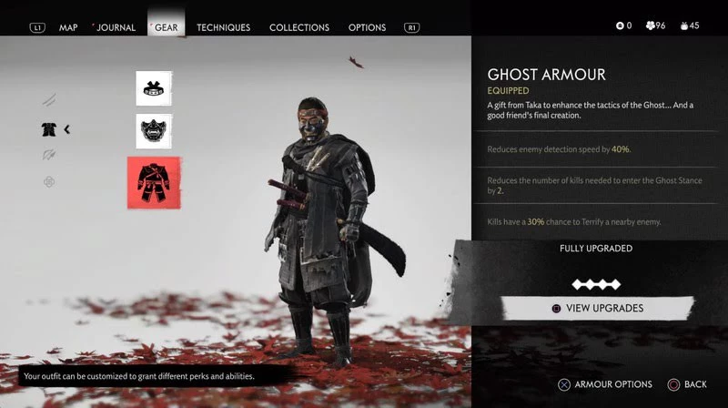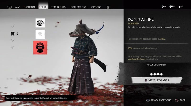Еще одно снаряжение, которое вы получите по сюжету игры в задании "Кровь на траве". Усиливает скрытность. Врагам будет сложнее обнаружить Дзина. Костюм увеличивает наносимый урон. Также, когда Дзин на корточках покидает высокую траву, противнику становится еще сложнее его обнаружить.