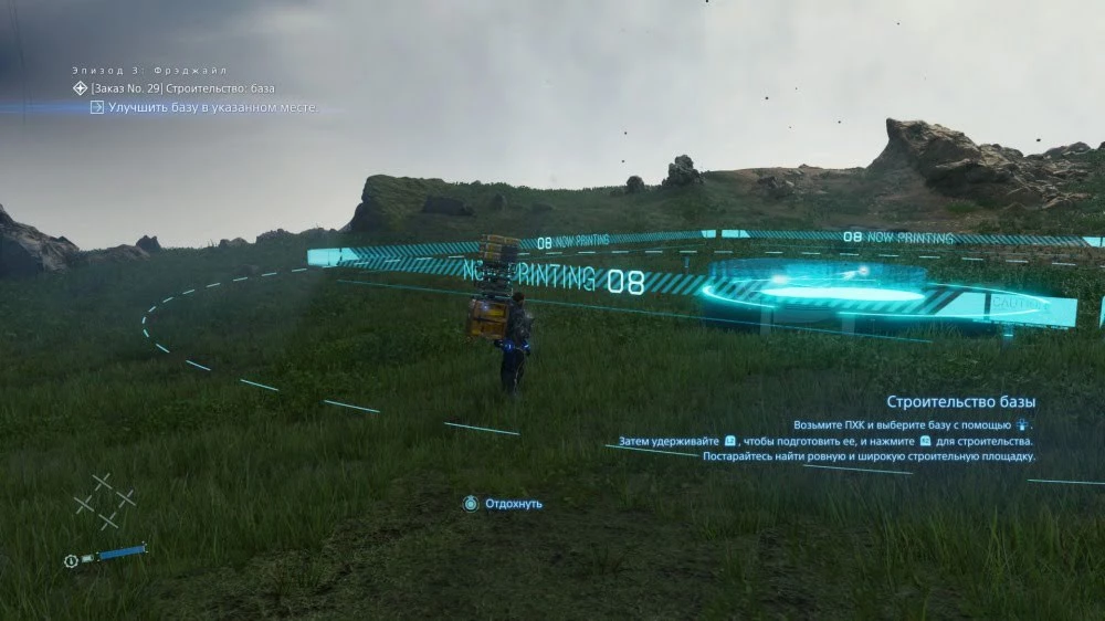 Нажмите вправо на крестовине геймпада, чтобы открыть меню инвентаря и выбрать ПХК, который вы хотите использовать. Версия 2 может создавать больше построек, таких как Тросс (Zip Lines) и Убежище от темпорального дождя (Timefall Shelters), но в большинстве случаев подойдет первая версия. Будет показан тип здания, поэтому просто нажимайте на крестовину, пока не дойдете до той постройки, которую захотите создать. Когда вы будете готовы, просто зажмите L2, чтобы посмотреть, сможете ли вы построить именно здесь. Есть несколько ограничений, в том числе необходимость быть в Хиральной сети и не строить на крутых склонах. Если постройка красного цвета, то вы не можете построить в этом месте, поэтому двигайтесь дальше, пока не найдете подходящее место. Как только вы окажетесь в удобном месте и будете готовы собрать постройку нажмите R2, продолжая удерживать L2.