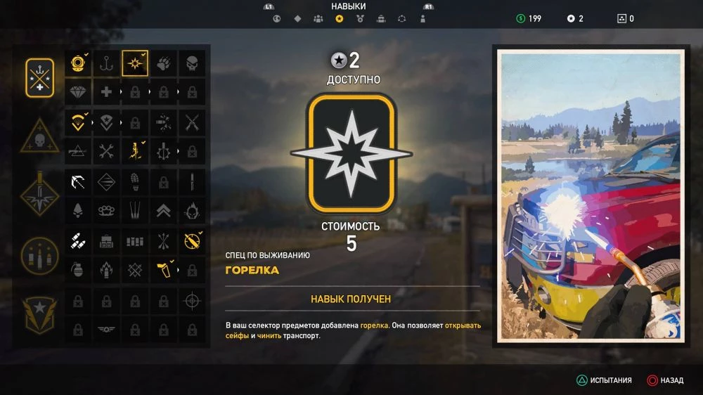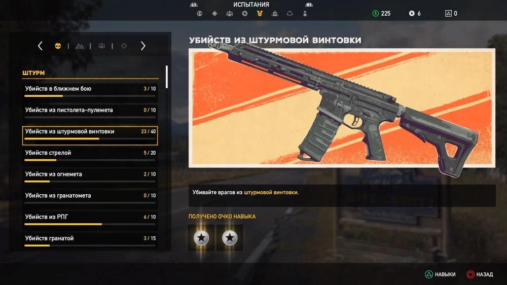 В разделе «Испытания» выполняйте различные челленджы, за которые вас будут награждать очками навыков. К примеру, убейте врагов из определенного оружия, либо пройдите то или иное расстояние при требуемых условиях. К слову не забывайте также про внутриигровую рыбалку, поскольку ловля рыбы будет отличным способом заработать очки навыков, выполнив большое количество испытаний сразу. Для этого вам лишь понадобится удочка и водоем, в котором водится рыба.