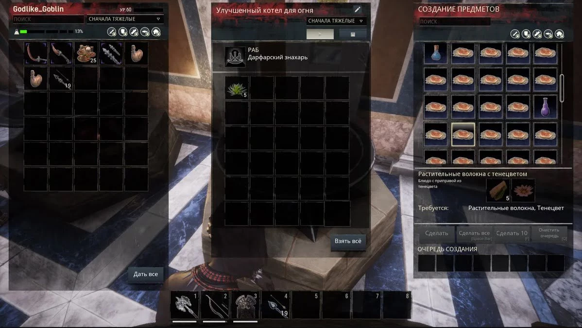 Корм с Тенецветом, как вы наверное помните, можно сделать в Котле для Огня. Для этого понадобятся растительные волокна и Тенецвет. Запасы которого можно хорошо пополнить во время прохождения подземелья Полуночная Роща.