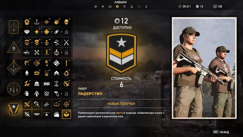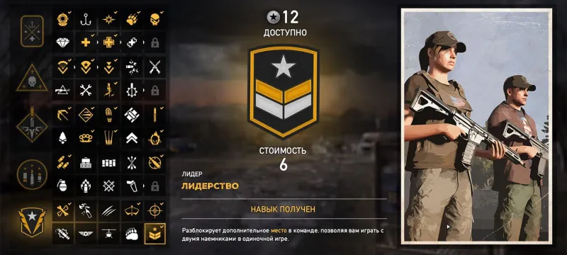 - Лидерство — 6 очков навыков. Разблокирует дополнительное место в команде, позволяя вам играть с двумя наемниками в одиночной игре.