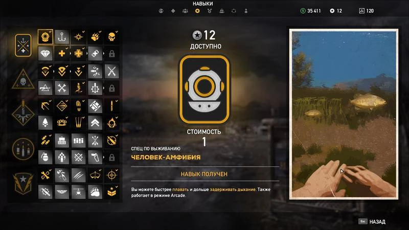 - Человек-амфибия — 1 очко навыков. Можете быстрее плавать и дольше задерживать дыхание. Также работает в режиме Arcade.