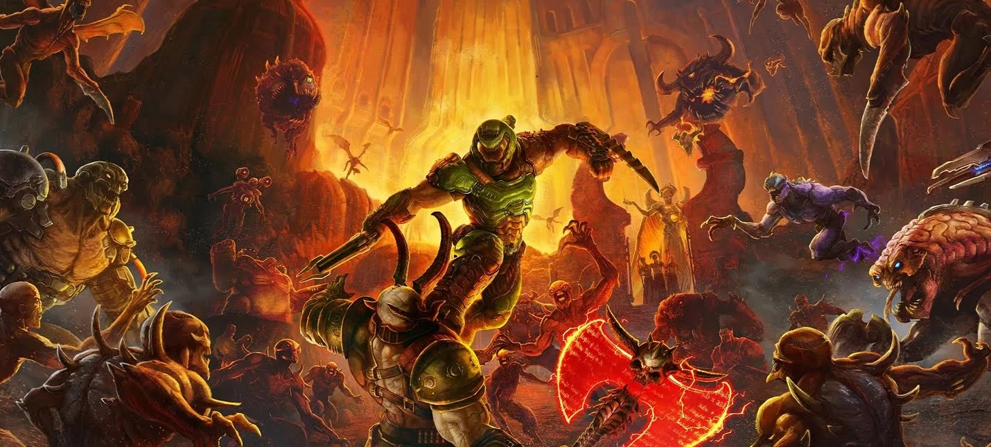 Первая Doom на PC была выпущена в 1993 году. Игра стал революционной для жанра. На той обложке изображен Палач, сражающийся с кучей демонов. Это знаковый кавер, который должен быть знаком каждому геймеры, даже если он особо не увлекался серией Doom.