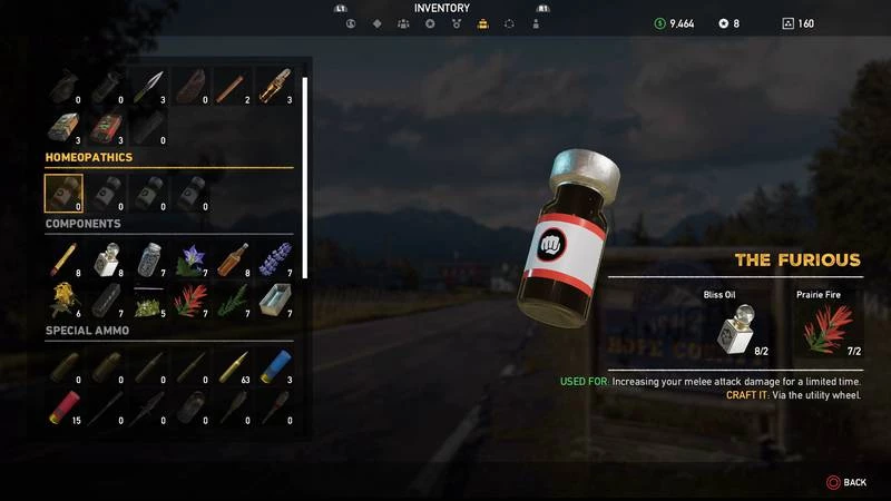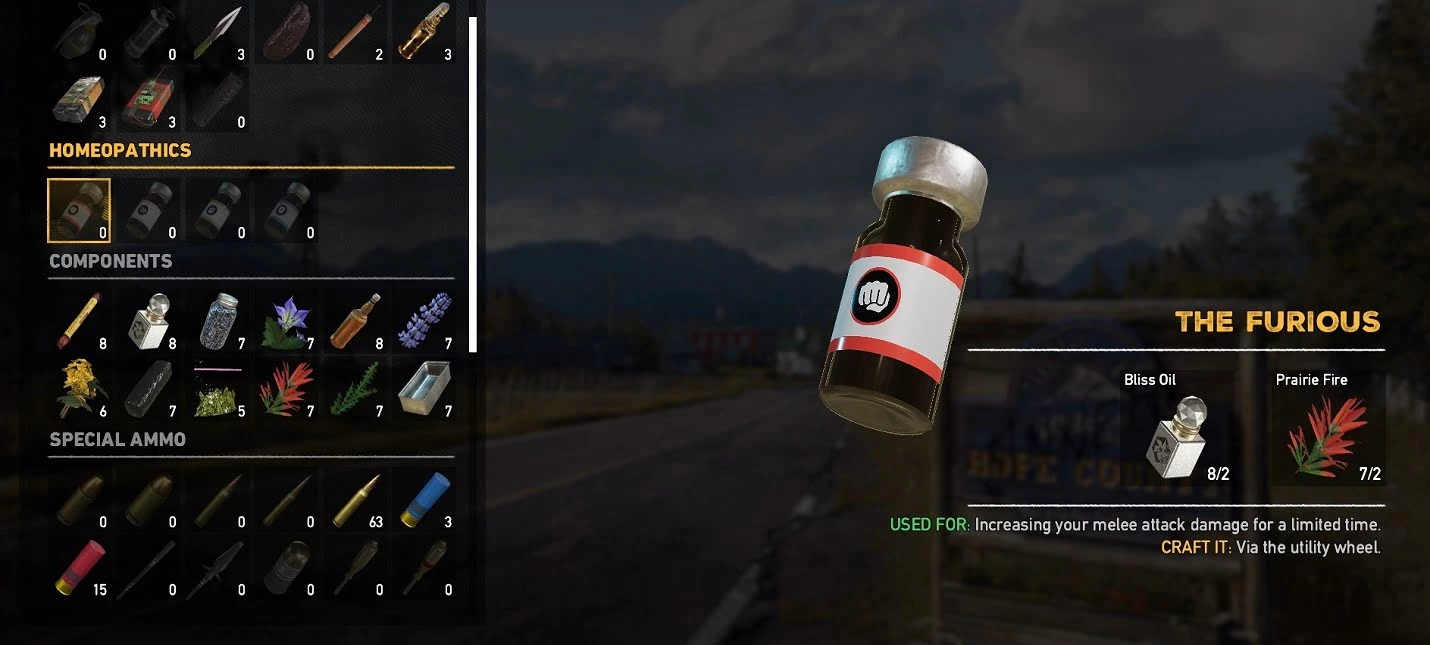 К сожалению, система обучения в Far Cry 5 слабо проработана, поэтому вы можете даже не подозревать о наличии препаратов под названием "гомеопаты". Существует возможность крафта различных усилителей. Выпив их, главный герой получает определенные бонусы в течение ограниченного отрезка времени.