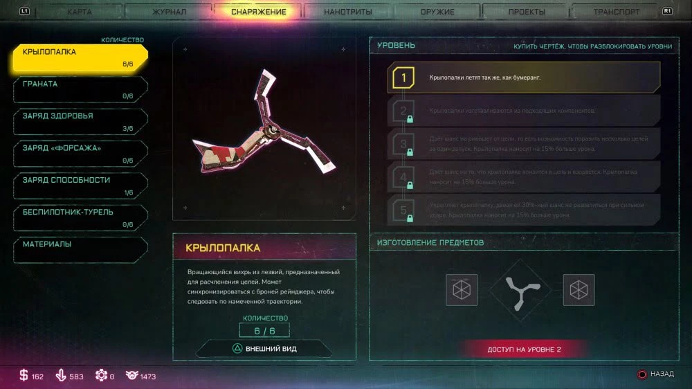 В этом меню слева — список предметов, для крафта которых вы имеете чертежи. Справа — уровень каждого предмета (их требует разблокировать отдельно, покупая чертежи-усовершенствования). Там же можно найти информацию о компонентах, требующихся для создания каждого предмета.