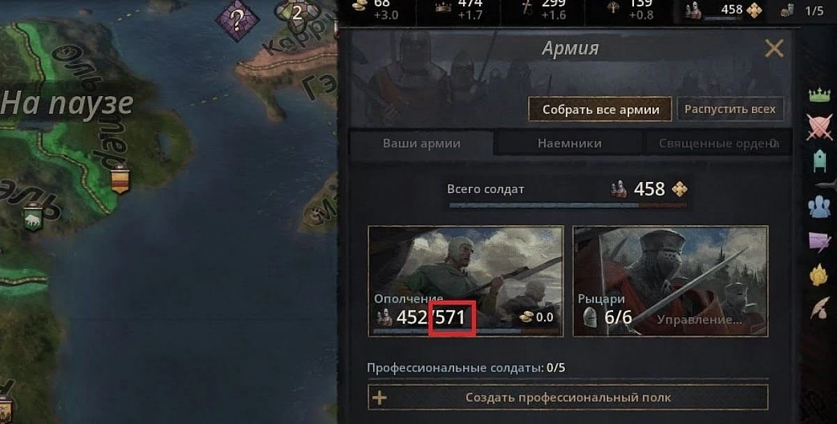 Большое войско — один из залогов успеха в любом противостоянии. В самом начале вашего королевства придется опираться на многочисленное ополчение. Посмотреть количество воинов можно в окне «Армия»: