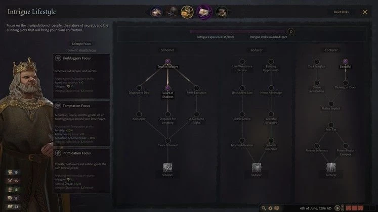 Интрига – это все, что связано с сюжетами, и главное дерево предлагает множество бонусов как для нападения, так и для защиты. Это включает схему похищения и дополнительный слот схемы враждебности, чтобы удвоить вашу подлость. Последняя разблокировка трейта также добавляет шанс успеха + 25% и Интригу +5.