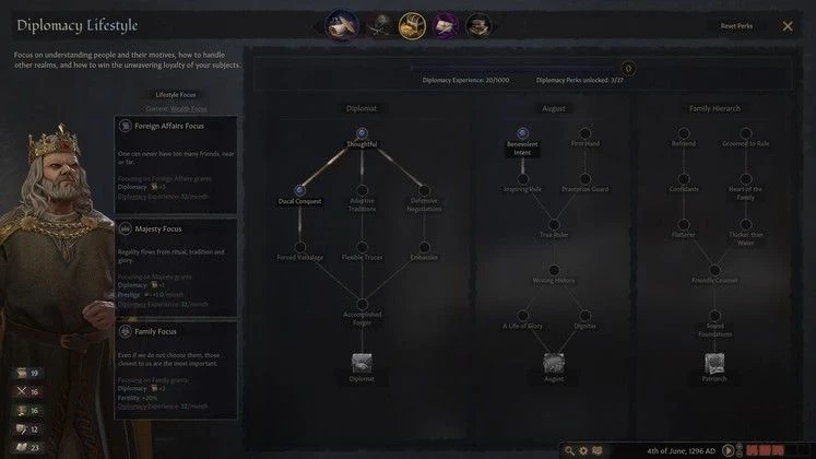 Дипломатия сосредоточена на том, чтобы лучше справляться с другими мирами, завоевывать друзей внутри себя и повышать этот престиж. Основное дерево предлагает больше способов ведения войны, включая разблокировку Герцогства и Принудительного вассалита Casus Belli. Он также включает более короткие перемирие без штрафа престижа за их разрыв и союзы без брака. Все это займет у вас время, но будет идеальным для тех, кто хочет быстро расширить свои владения в более слабые миры, где победы будут легкими и дешевыми.