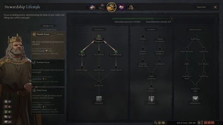Для навыка, направленного на получение дохода, главное дерево здесь кажется довольно бессмысленным, поскольку оно действительно полезно только в том случае, если вам гарантированы мир и хорошие отношения. Тем не менее, дерево архитектора хорошо подходит для роста зданий и имеет разблокировку для 100% -ного пополнения сборов, что должно держать ваши армии в полной готовности. Дерево администратора также может быть очень полезно для обеспечения лояльности ваших самых могущественных вассалов с мнением вассала +10 и еще +20 для советников, а также бонус действия совета по внутренним делам + 25%.