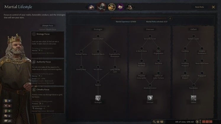 Главное дерево в Martial – это военная сила. Это может значительно увеличить урон и стойкость ваших солдатских отрядов, а также усилить их эффекты камень-ножницы-бумага. Последний перк, разблокируемый для дерева, – это стратег, который, откровенно говоря, превосходен. Он дает Дипломатию +1, Боевой уровень +3, Смертельные потери врагов + 25% и отменяет штраф за переход через реку, и для правителей, желающих вести войну с противниками аналогичного размера, все это очень ценно.