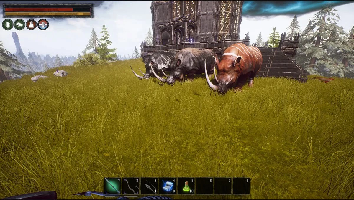 Вместе с лошадями, теперь в качестве ездовых животных можно использовать носорогов. Для этого вам понадобится загон для животных, в котором нужно будет вырастить обычного носорога. Из белых и черных носорогов, получаются только боевые звери, будьте внимательны! Затем с помощью специального корма, свареного в котле для огня, обычного носорога нужно будет превратить в ездового, и только потом выставлять его. За покупку Dlc, во время раннего доступа, вы получите эксклюзивную расцветку для ездового носорога - Матерый Носорог. Верхом на носорогах сражаться можно только с помощью копья или лука. Также нажимая "пробел" вы можете атаковать врагов самим носорогом. К сожалению, как и лошади, ездовые носороги абсолютно беззащитны и не вступают в бой, вообще.