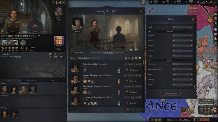 В любом случае, процесс создания брака прост. Когда вы просматриваете портрет персонажа, вы увидите, есть ли у него супруга, и если у вас есть возможность выбрать партнера, то все, что вам нужно сделать, это щелкнуть пустое место. Это вызывает окно брака с выбранным персонажем слева и длинным списком не состоящих в браке кандидатов внизу.