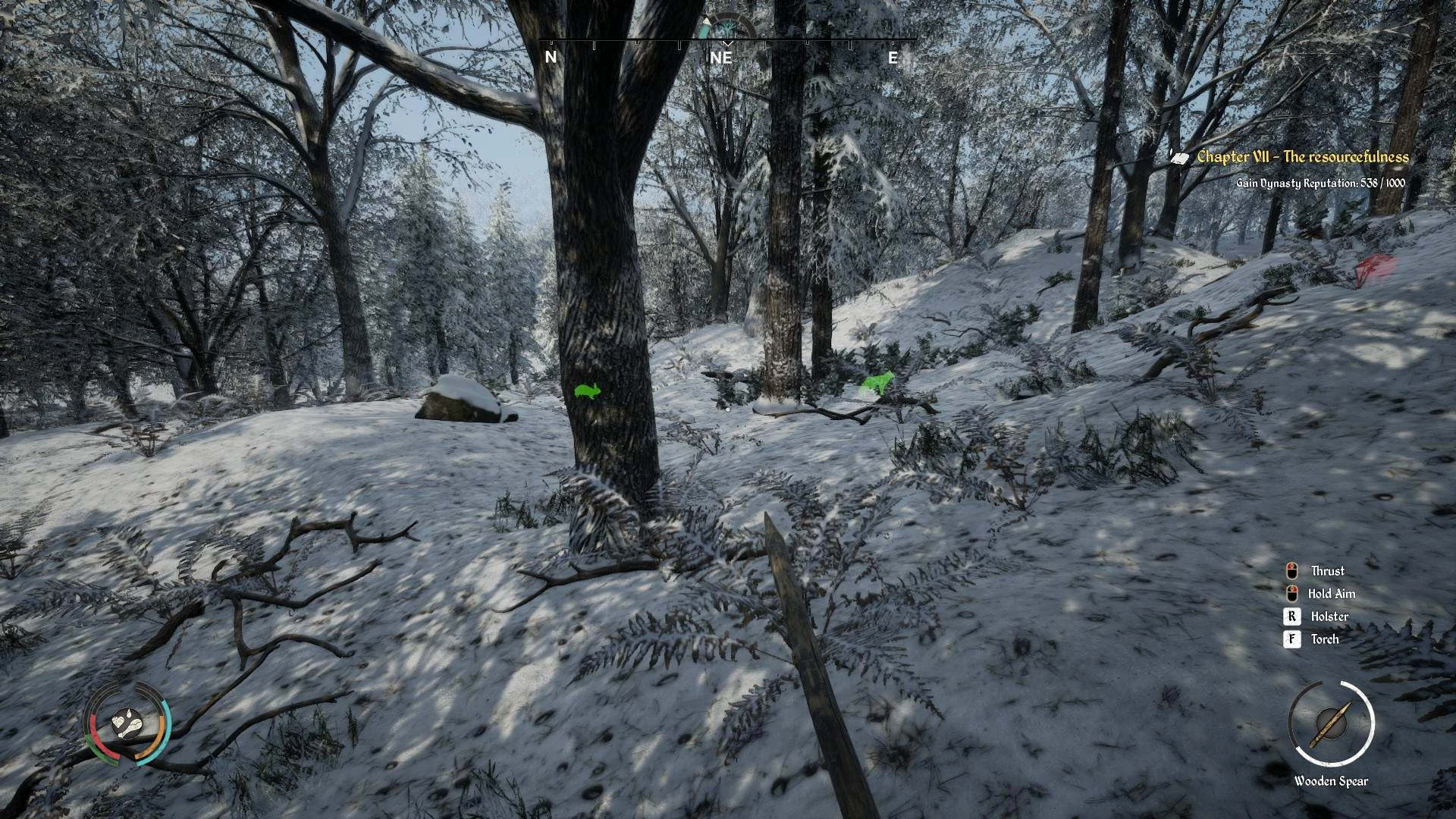 Если вы будете удерживать кнопку ALT, то вы войдете в режим проверки. Он потребляет вашу выносливость и показывает вам, где вы уронили какие-то предметы или куда пропали ваши копья (стрелы) после того, как вы бросили их. Он также показывает вам имена людей в деревнях, а также их навыки, чтобы вы могли лучше выбрать, кого вы хотите взять в свою деревню.