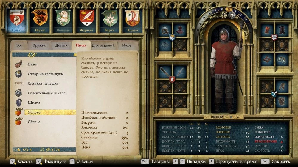 В Kingdom Come: Deliverance все предметы могут быть сломаны или испорчены. Помните это, чтобы случайно не оказаться перед сильным врагом в броне, которая вас не защитит. Прочность отображается в инвентаре.