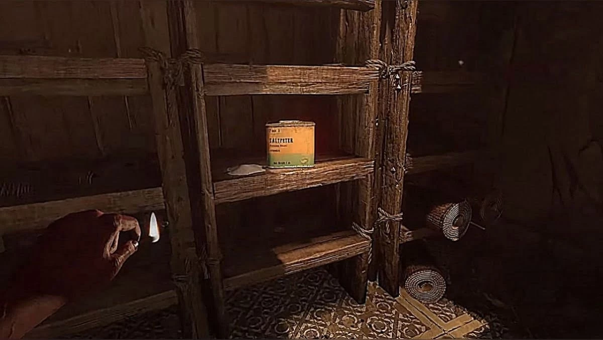А вот за селитрой придется вернуться на склад квартирмейстера, откуда героиня только что сбежала. Поднимитесь по лестнице и найдите открытую дверь на склад. Там на полке будет канистра с селитрой. Теперь быстро возвращайтесь назад.