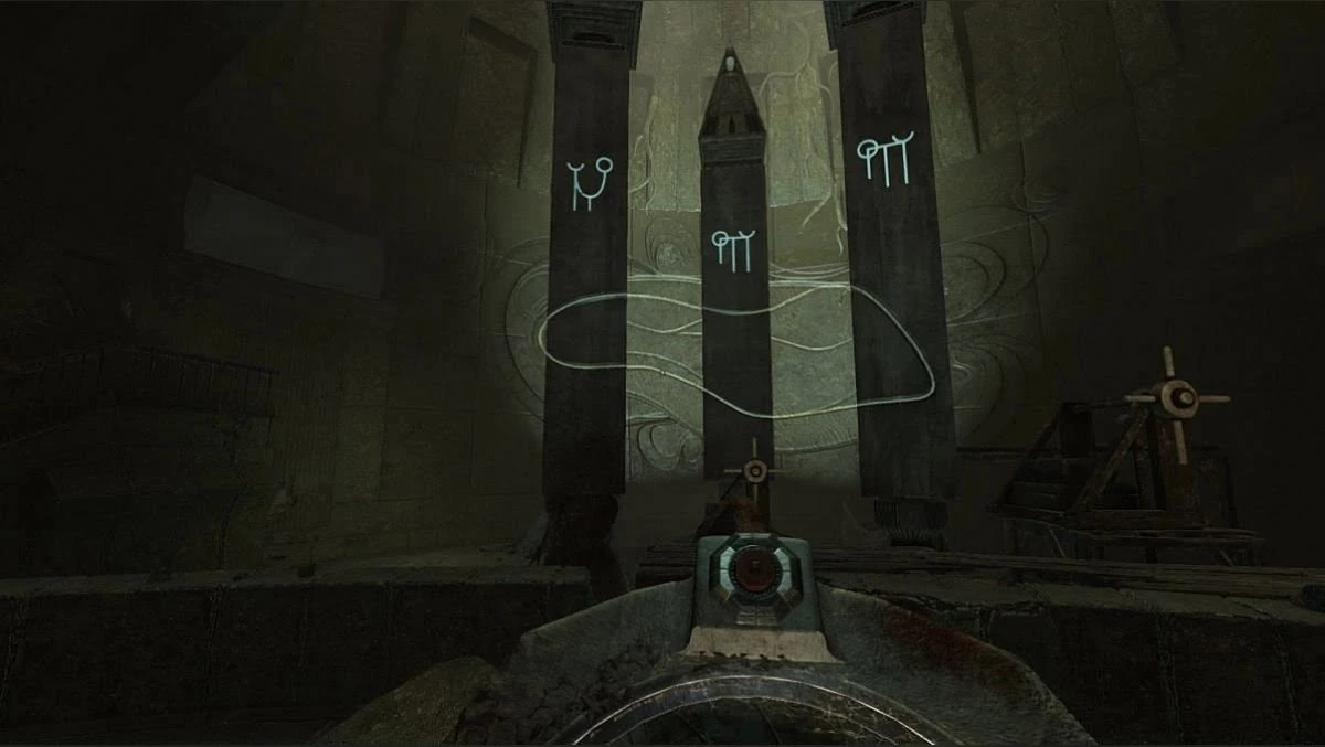 Вы попадете в зал с тремя колоннами, на которых изображены символы. Неподалеку будет расположена панель управления, похожая на ту, что мы видели ранее. Значков на ней теперь не хватает, поэтому придется как-то выкручиваться. Вы можете повернуть колонны (только две из них) и саму панель. Левая колонна не двигается, поэтому первый символ у нас уже есть. Если не хотите мучиться и подбирать комбинацию самостоятельно, то правильный ответ — на скриншоте.