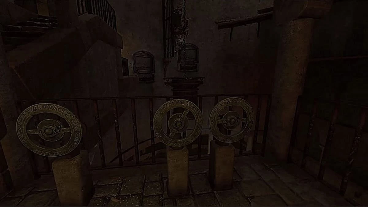 Далее идите по коридору пока не окажетесь в комнате с закрытой решетчатой дверью и ловушкой. Внутрь можно попасть двумя путями: через окно, перепрыгнув по карнизу или открыв ключом, который держит мертвец, застрявший в одной из решеток. Если пойдете вторым путем, то после того, как дернете дверь, сразу отбегайте назад.