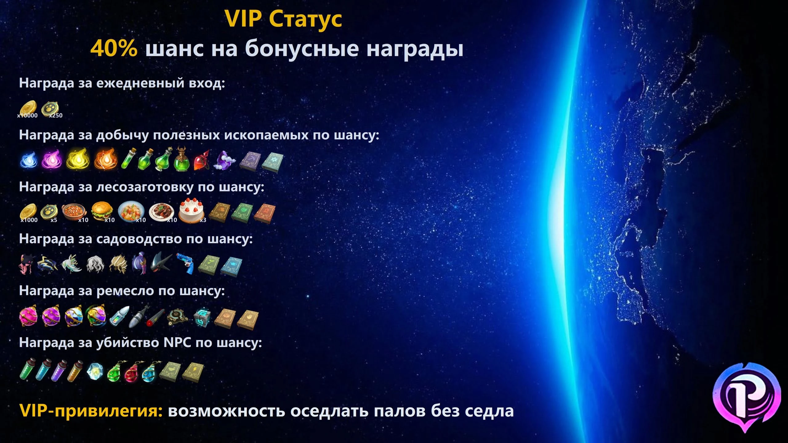 Легкий фарм и уютная атмосфера – играй с комфортом и удовольствием!VIP статус – выделяйся среди других, получай невероятные бонусы и тонны наград!