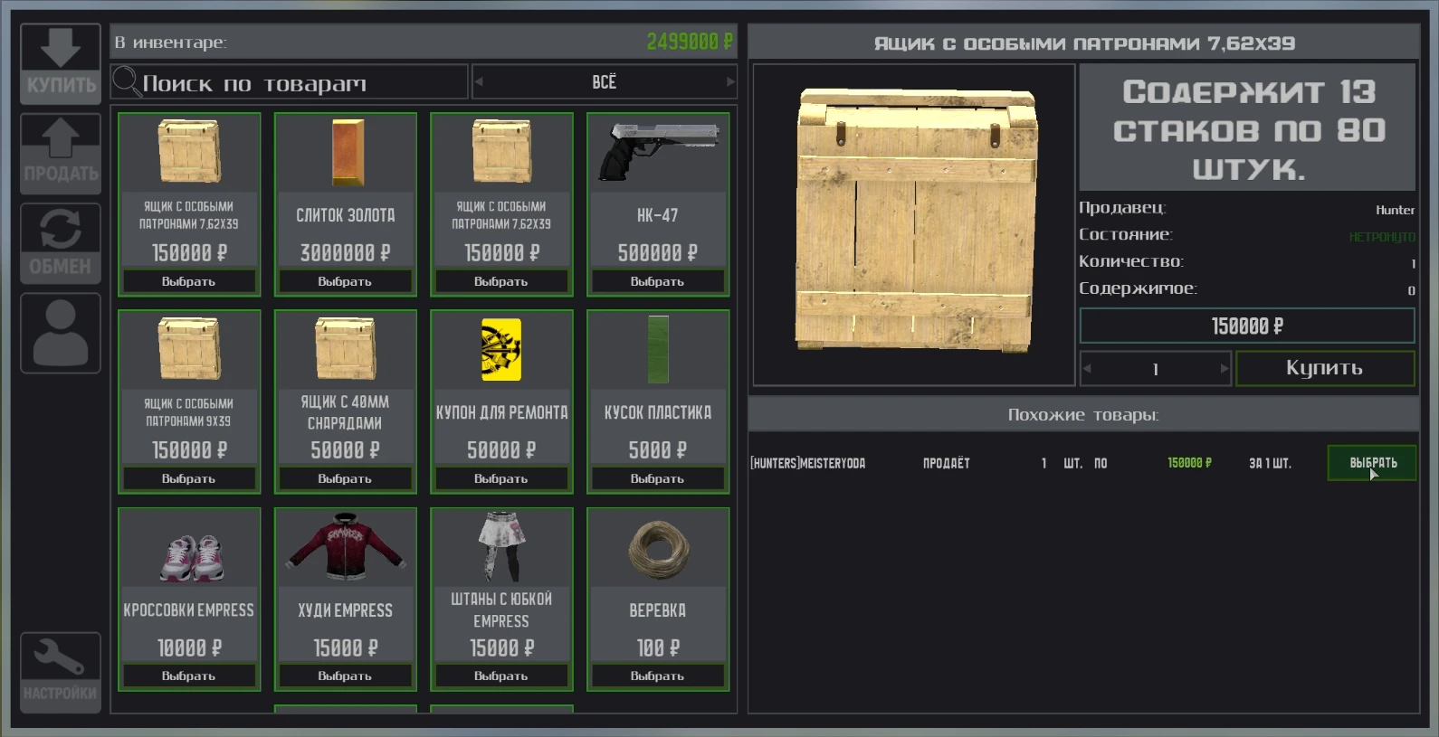 - Если вы не нашли нужный вам предмет в продаваемых, вы можете создать запрос на покупку. Перейдите в личный кабинет, найдите нужный предмет, выставьте цену, которую готовы заплатить за него, укажите количество и минимальное состояние. Деньги будут списаны с вас сразу, имейте необходимую сумму в инвентаре. Если другой игрок соберётся продавать подходящий предмет на площадке, он сразу увидит ваш запрос и сможет продать вам предмет, без выставления на площадку. Свои запросы можно посмотреть личном кабинете. Если вы больше не хотите покупать предмет, вы можете удалить запрос. Деньги вернуться вам в личный кабинет.
