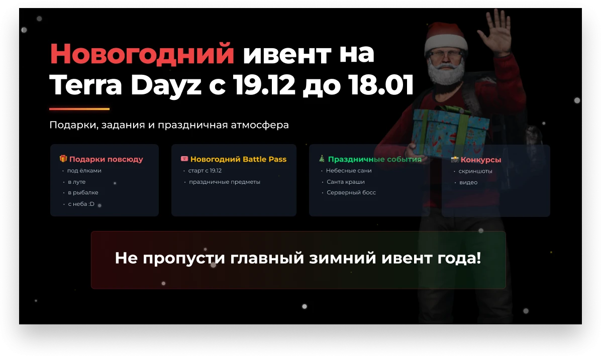 - летающий санта, который скидывает подарки по всей карте Чернорусси с рандомный лутам, но будь осторожен может быть сброшен опасный груз;